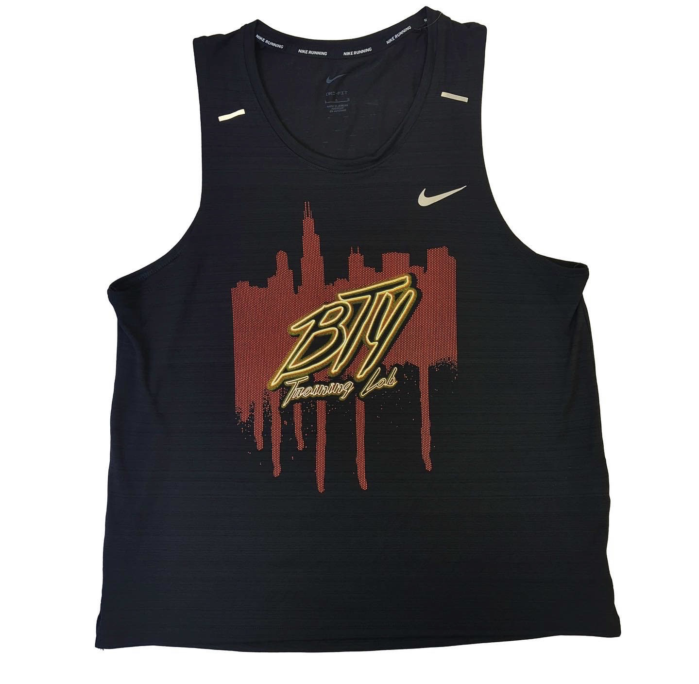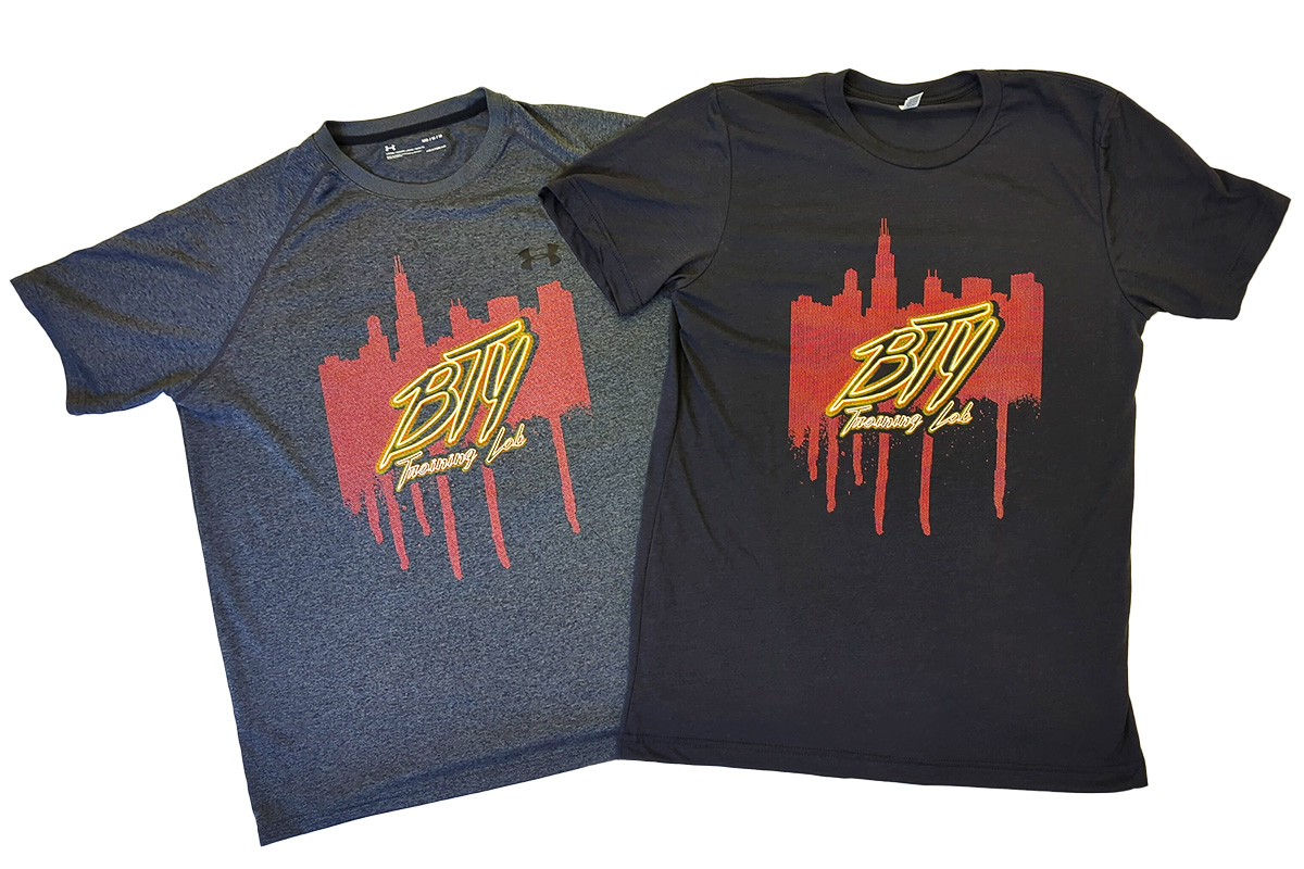 First, BTY requested neon printed tank tops, stickers, and more for their training gym in Chicago. This project was fun to work on because it gave us the ability to custom design their artwork from scratch with only examples of images found on the internet. For this reason, printing something with this complexity requires using special separations software. Not to mention, a highly technical screen printing method called simulated process printing. Additionally, we printed with specific red, yellow and orange inks with different halftone frequencies. As a result, we were able to print realistic neon designs that pop off their Nike workout apparel.